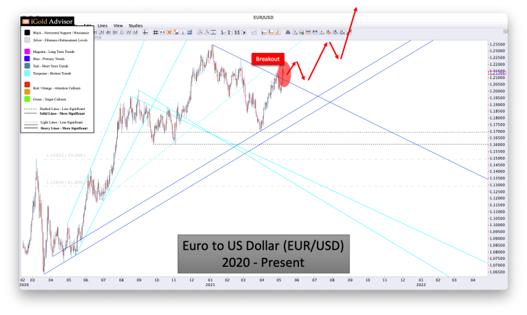 - The euro has just broken out against the dollar (red callout) by closing above 1.21 for the week.