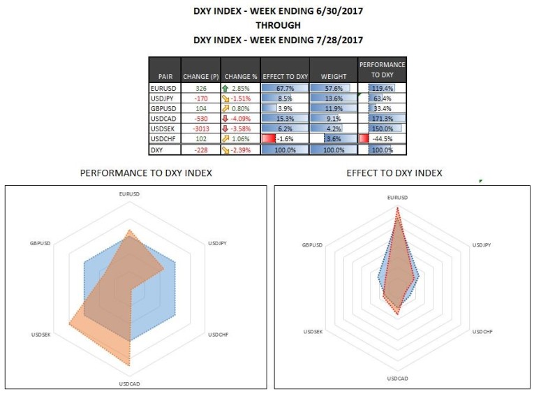 The US Dollar rose close to 1.6% against the Swiss Franc in July while the Index as whole moved down 2.39%. The Pound and the Yen also underperformed the DXY Index but did still move in higher against the US Dollar in July. The Canadian Dollar and the Swedish Krona outperformed the DXY Index with the U.S. Dollar vs. the Canadian Dollar dropping over 4% in July.