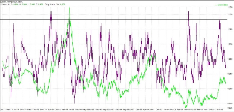 .... but to put things into a longer perspective, look at the chart below. The aforementioned US Dollar Index is charted in green since its inception in the early 1970s when the dollar finally shrugged off any pretence to being linked to gold.