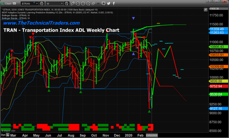Lastly, this TRAN (Transportation Index) Weekly chart highlights was we believe to be a more true valuation event setting up over the next 60 to 90+ days. This ADL chart suggests the TRAN price will almost immediately move back to levels near 11,000 (with a potential for a new high print above 11,300), then consolidate near 10,800 before breaking lower in late April or early May. This type of price action aligns with the Q1 results reflecting an economic contraction while optimistic investors attempt to push price levels back towards recent highs before the reality sets into the markets. The real forward expectations of Q2-2020 and Q3-2020 may be a fraction of levels reported for Q4-2019.