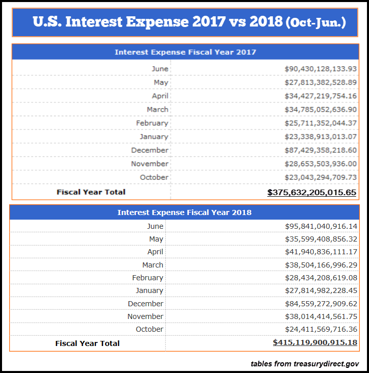 Now, if we consider that the US Treasury paid $83 billion in interest expense for the three remaining months last year, and add it to the current total, it would equal $498 billion. However, the US interest expense is up over 10% already. So, if we assume that the interest expense for July-Sept will also be up 10%, then the estimated total debt service for fiscal 2018 will reach $506-$510 billion.