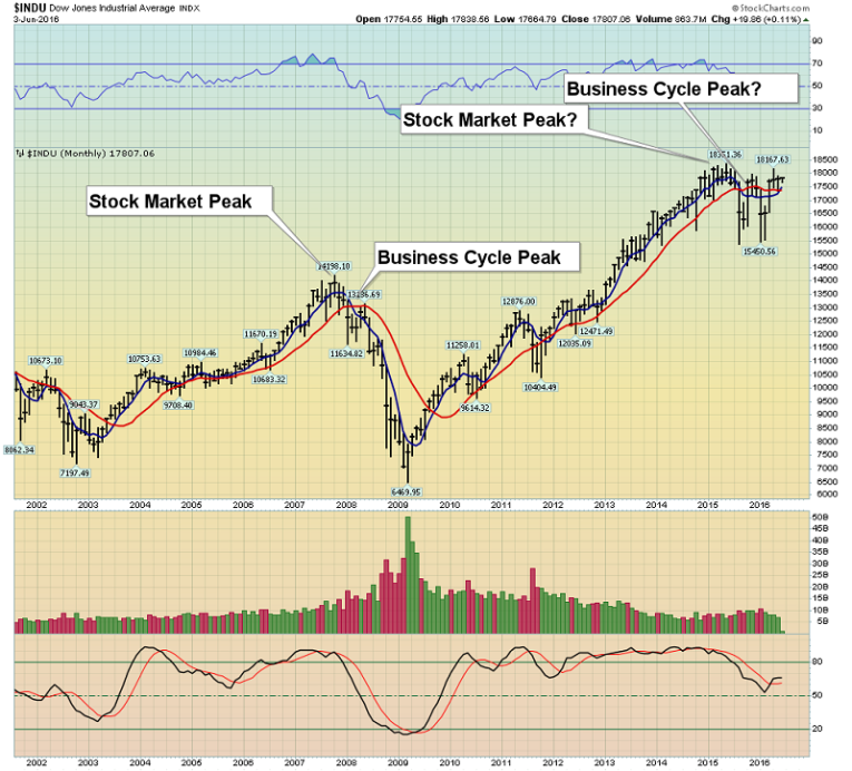 This monthly Dow Index chart shows a stock market and business cycle peak in 2007/2008…and a potentially similar peak in play now.