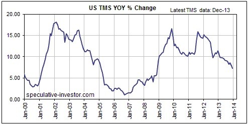 One implication is that the Fed's "tapering" probably won't run its planned course. If the monetary inflation rate keeps falling then by the middle of this year there will be enough weakness in the US stock market and economy to cause the Fed to increase, rather than to reduce, its 'monetary accommodation'.