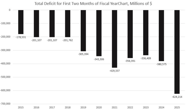 That’s the largest total ever for the first two months of the fiscal year, higher even than the $429 billion spent during the first two months of the 2021 fiscal year—October and November 2020. It should not surprise us, then, that the federal government is now on track to have the largest peacetime deficit of all time during the 2025 fiscal year. With the two-month total at over $620 billion, the year-end total is likely to be over $3.5 trillion by the end of the year. That would make the next annual deficit even larger than 2020’s budget busting deficit of 2020 when the covid panic fueled months of runaway spending.