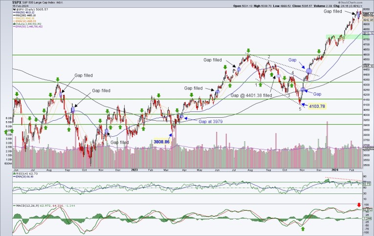 Now let’s again consider all those downside gaps. Sooner or later they are likely to fill. Could well be later, but there are other things going on here that could precede a correction. They are listed after the chart.
