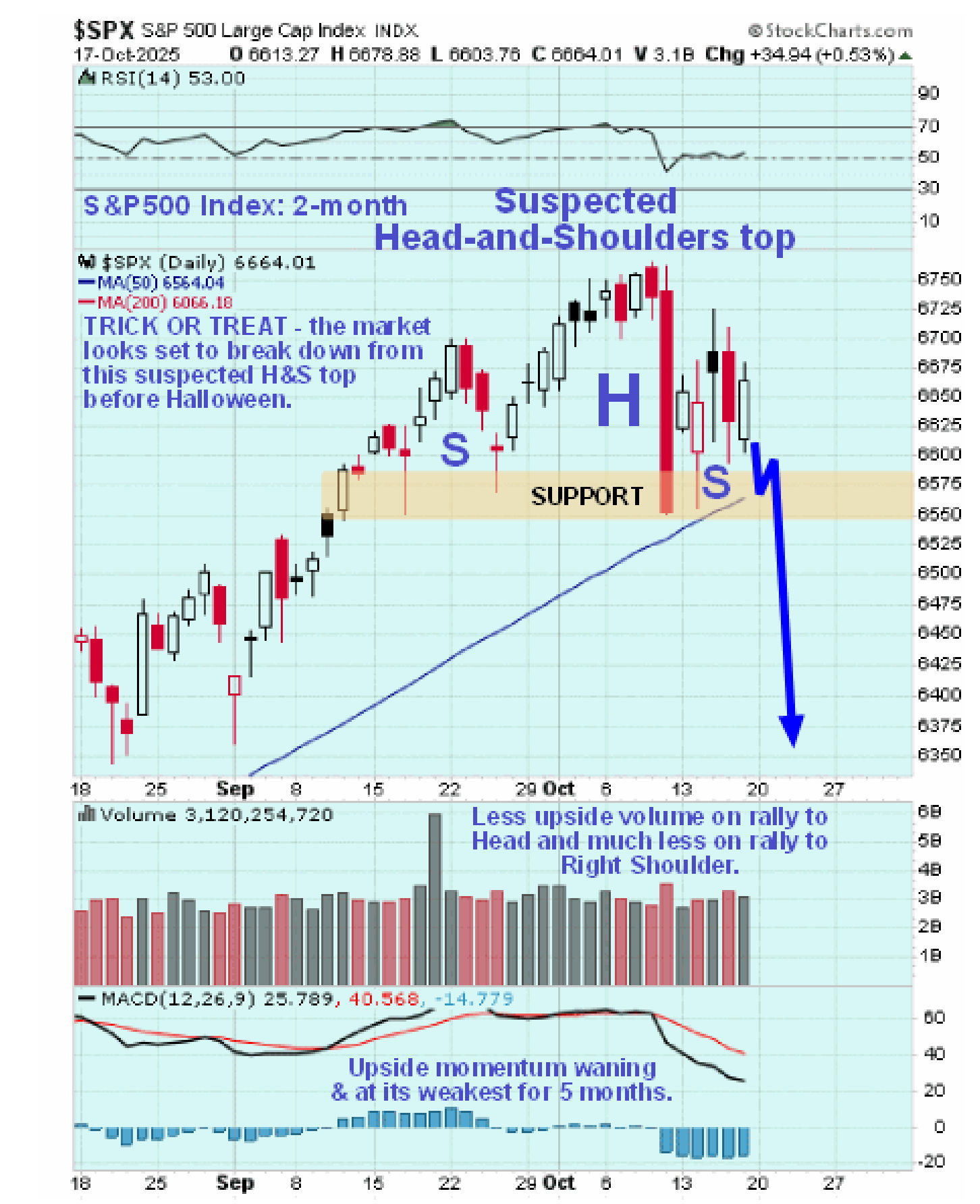 On the 7-month chart we can see how, following the “crashlet” last April, the index recovered smartly before advancing in a much more measured manner ever since, culminating in the peak early this month when the price arrived at the highest point of the large Distribution Dome shown having opened up a substantial gap with its 200-day moving average. A warning sign is the gradual diminution of upside momentum (MACD) since July which took a real hit as a result of the sharp drop over a week ago. This is viewed as a “shot across the bows” and as a signal that the market is readying to break down. So now we’ll look at the S&P500 index on a much shorter-term chart in an effort to determine what is going on.