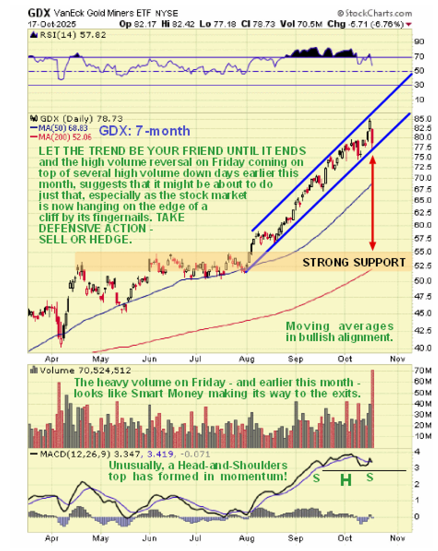 On the 7-month chart we can see the steep and thus far orderly uptrend in force from the start of August and the warning signs that it is probably about to fail, namely the reversal on very heavy volume on Friday which looks like Smart Money bolting for the exits and this is especially so as there were a couple of high volume down days earlier this month. In addition we can see that upside momentum is starting to fail with, unusually, a Head-and-Shoulders top appearing to form in the MACD indicator and if this breaks down then GDX is likely to plunge and as it is currently way above its 200-day moving average it could correct back down towards this indicator. A reason that the drop could be fierce is that most everyone is bullish on the sector and “is on one side of the boat” so the switch from greed to fear could be something to behold.