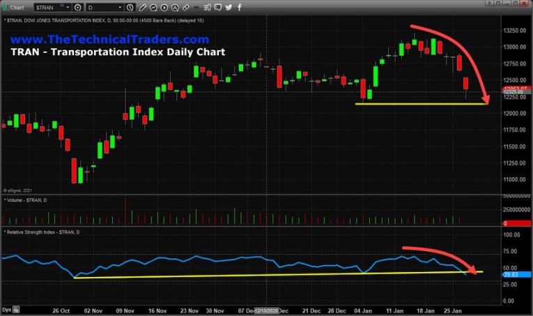 The following Transportation Index daily chart shows a very clear picture of how this “rollover” in the markets has setup and where real support is likely to be found. The early January lows, near 12,180 are the most likely immediate support level on the TRAN Daily chart, below. If the US stock market attempts to find immediate support to sustain the current bullish rally trend, then this level in the TRAN will likely hold up well over the next few days/weeks. Otherwise, if the TRAN breaks below this level, then the next viable downside target become the November 2020 lows (or somewhere close to those levels).