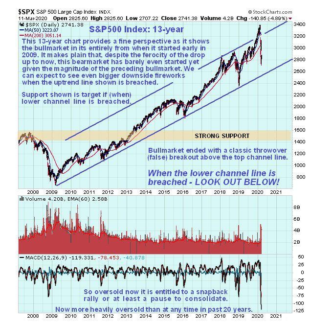 The 2 charts shown below are intended to give you a “big picture” perspective. The 1st of them is the 13-year chart for the S&P500 index that shows the entire bullmarket from its inception early in 2009, which makes two important points very clear. The first point is that, compared to what came before it, this bearmarket has barely started yet, and it has much, much further to run in a decline that may take years to play out. The second point is that, on a short-term basis, it is record oversold by a country mile, making a near-term snapback rally a high probability soon, even if we see more downside first, which could of course be occasioned by the vaunted “stimulus package”.