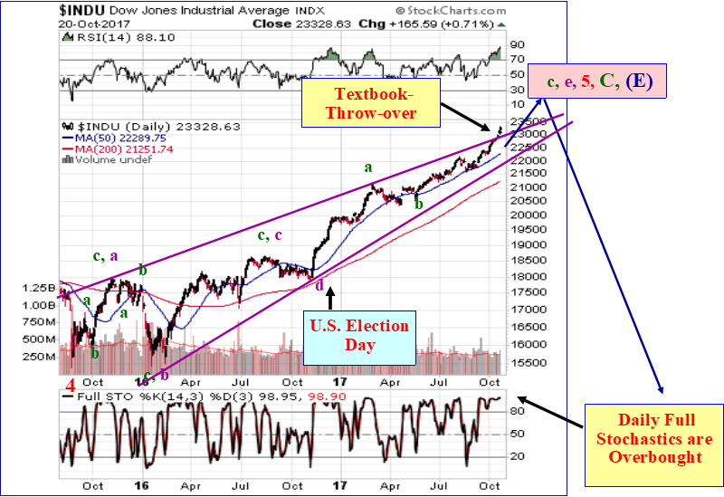 Our next chart shows the Dow Industrials completing a five wave Rising Bearish Wedge that started back in August 2015. The upper and lower boundary lines have converged, and the pattern is nearly complete as prices have exceeded the upper boundary line during its fifth and final wave in a typical textbook “throw-over.” This signals the end is near. Note that the minimum downside price target for this intermediate term highly reliable stock pattern is 15,500 for the Industrials, a 33 percent drop. Ouch.