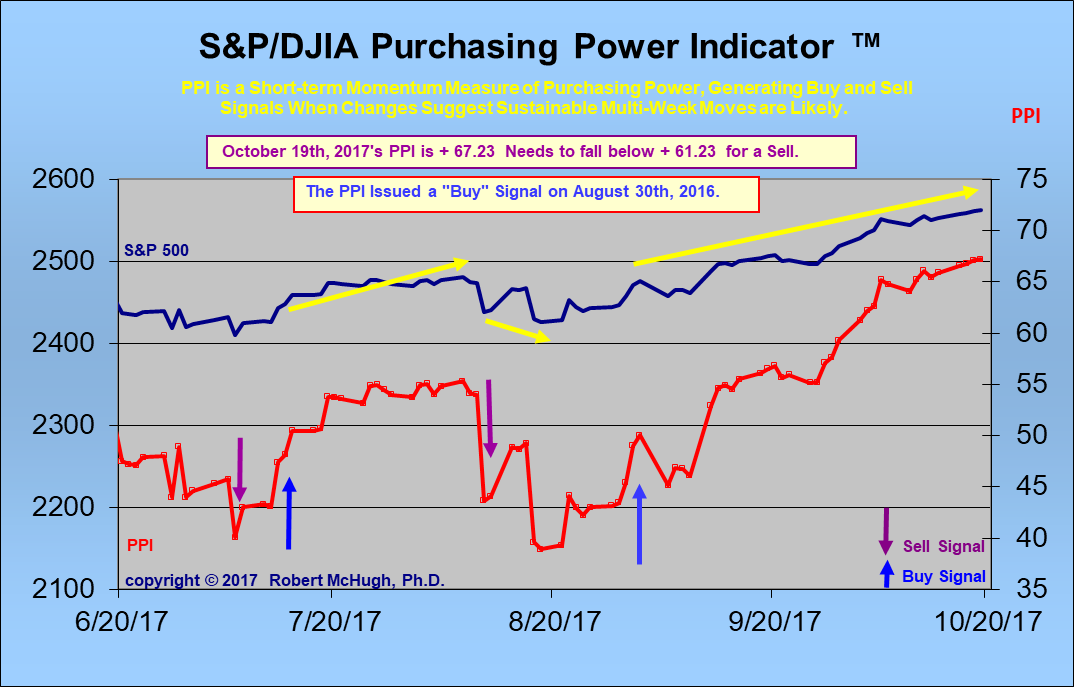 First is our Purchasing Power Indicator, which does a great job identifying strong short-term trend turns. After our Purchasing Power Indicator generated a Buy signal on November 7th, 2016, right after the election, the Industrials rose 1,715 points! After the Purchasing Power Indicator reentered a Buy signal on January 3rd, 2017, the Industrials rose 1,234 points. And now, since the PPI Buy signal on August 30th, the Industrials so far have risen 1,436 points. This signal has captured 4,385 Dow Industrials rally points since the November 2016 election. It works on the Sell side as well. After our PPI generated a Sell on July 24th, 2015 the Industrials fell 2,198 points. Here is a current chart comparing our Purchasing Power Indicator with the S&P 500: