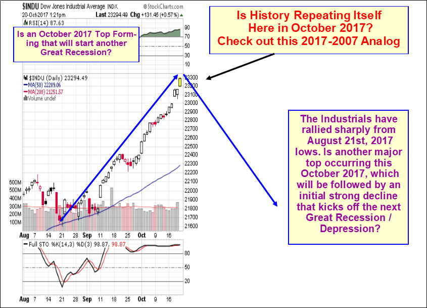 Next, let’s examine a fascinating price pattern Analog between 2007 and here in 2017. There is a striking similarity between the stock rise to a Bull market top from August 2007 through October 2007 (which concluded a 4-year Bull market on October 11th which was followed by the Great Recession and a Bear market that wiped out 55 percent of the stock market) and the stock rise from August 2017 through October 2017, which we believe is concluding the 8 Year Bull market from 2009. Check out these charts below. The point of analogs is they identify similar psychological profiles for the totality of stock investors during two different time periods, giving us an insight into what could happen next.