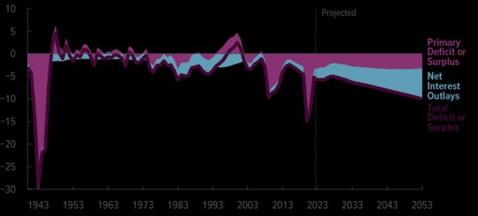 Source: The 2023 Long-Term Budget Outlook (Congressional Budget Office, June 2023), figure 1-1.