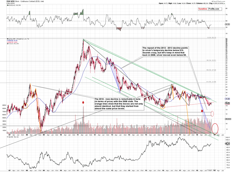 From the broad perspective, it’s clear that the white metal remains below the previously broken rising long-term support / resistance line. It’s currently at about $15, so even a move to this level would not change anything from the technical point of view.