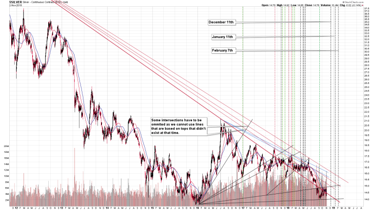 Taking both charts into account and their own implications, we get a situation, in which the precious metals market is likely to reverse initially close to the middle of December 2018 and then once again in early January. Both are not very precise, though, and additional signs should be considered before adjusting one’s position. The key take-away is that a major reversal is likely to take place in the first half of February, 2019. This target is confirmed not only by three triangle-vertex-based reversals in gold, but also by one in silver.