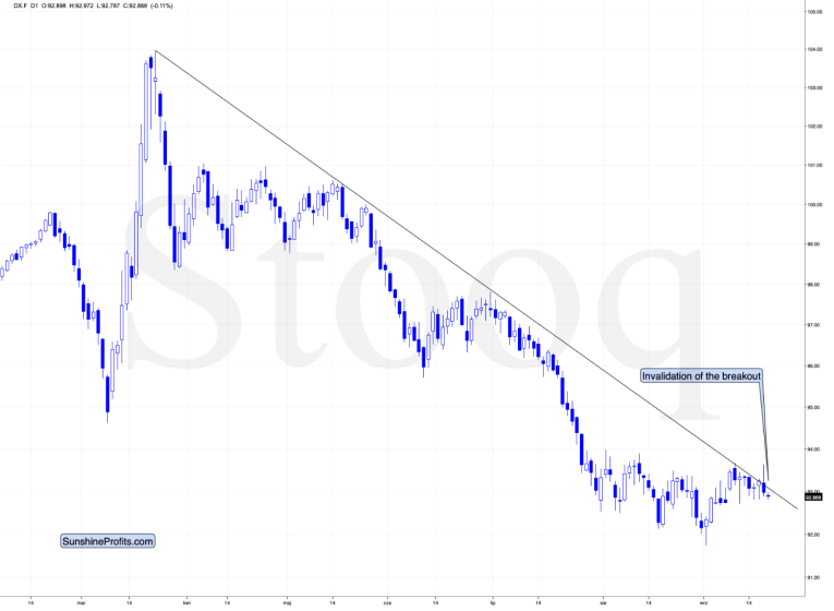 In other words, the bearish outlook for gold didn’t really change at all, even though we admit that it is not as bearish as it was before the USDX’s breakout’s invalidation. While we continue to predict lower gold prices, in the next several weeks (possibly months), based on the USDX action, we agree that the outlook is slightly less bearish than it was in the previous days.