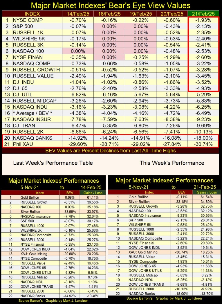 In the performance tables above, gold remains at #1, as silver advanced from #4 to #2, gaining just under 1% in price. All the other stock indexes fell this week, including the gold and silver miners in the XAU.