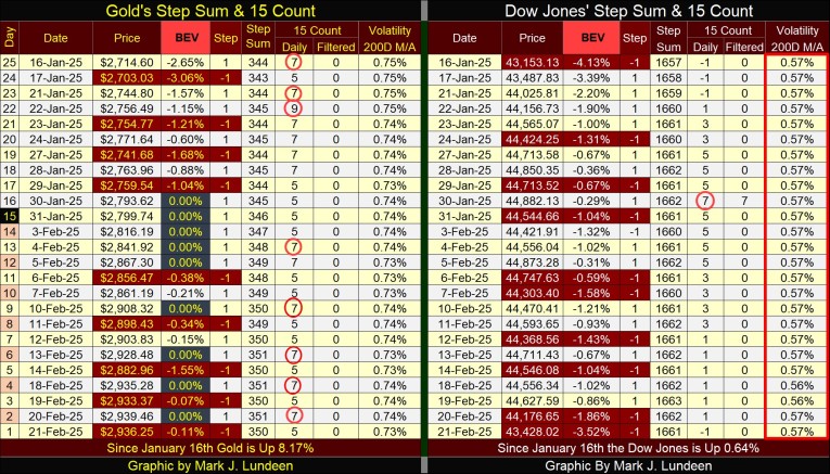 Gold in its step sum table below is on a tear. It has been an overbought market (15-count of +7, or more), for well over a month, and has seen nine new BEV Zeros (new all-time highs) since the end of January.