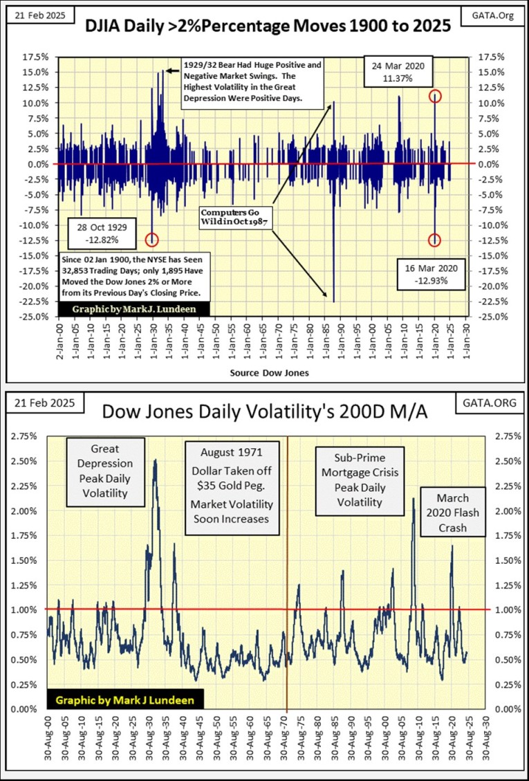 Below, I have two charts for daily volatility for the Dow Jones, going back January 1900, 125 years of market history. The top chart plots the actual daily volatility for the Dow Jones. Bull markets are low volatility markets, that rarely see the Dow Jones move 2%, or more from a previous day’s closing price.