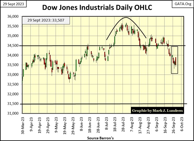 The last two weeks for the Dow Jones in its daily bar chart below are lame. So far, the 33,500 level is holding. On Friday’s close, this key level held on by 7 points, by its fingernails. I’m thinking 33,500 is history, so I’m moving on. The question now is; will the Dow Jones close next week above or below its 33,000 level, and then what?