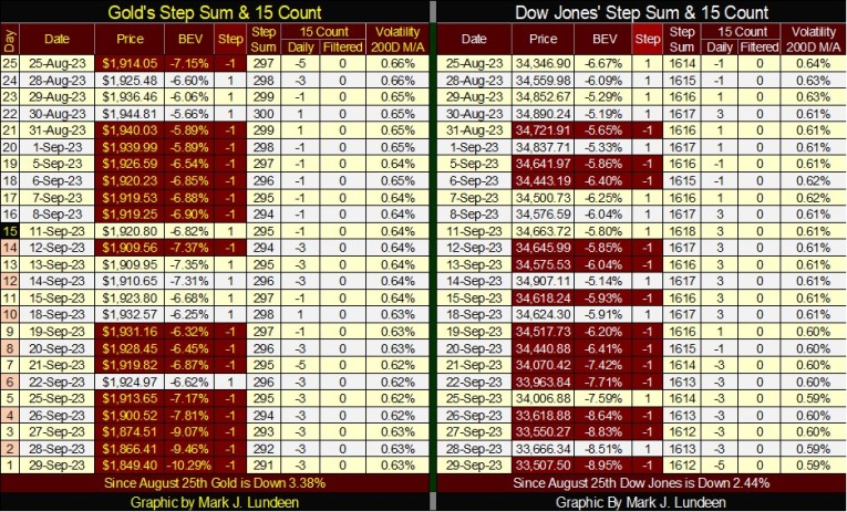 In gold’s step sum table below, the pressure being applied to keep its price low can be seen. In the past twenty-five trading sessions, sixteen saw gold close lower than the day before. The goons finally got gold to close below $1900, gold closed the week at $1849.40. With gold’s 15-count at a -3, gold isn’t oversold yet. But if next week looks like this week, five continuous down days, that would change quickly. I expect we’re close to a bottom in the gold market. Soon we’ll see daily advances overwhelm daily declines, and hopefully the price of gold will do something when that happens.