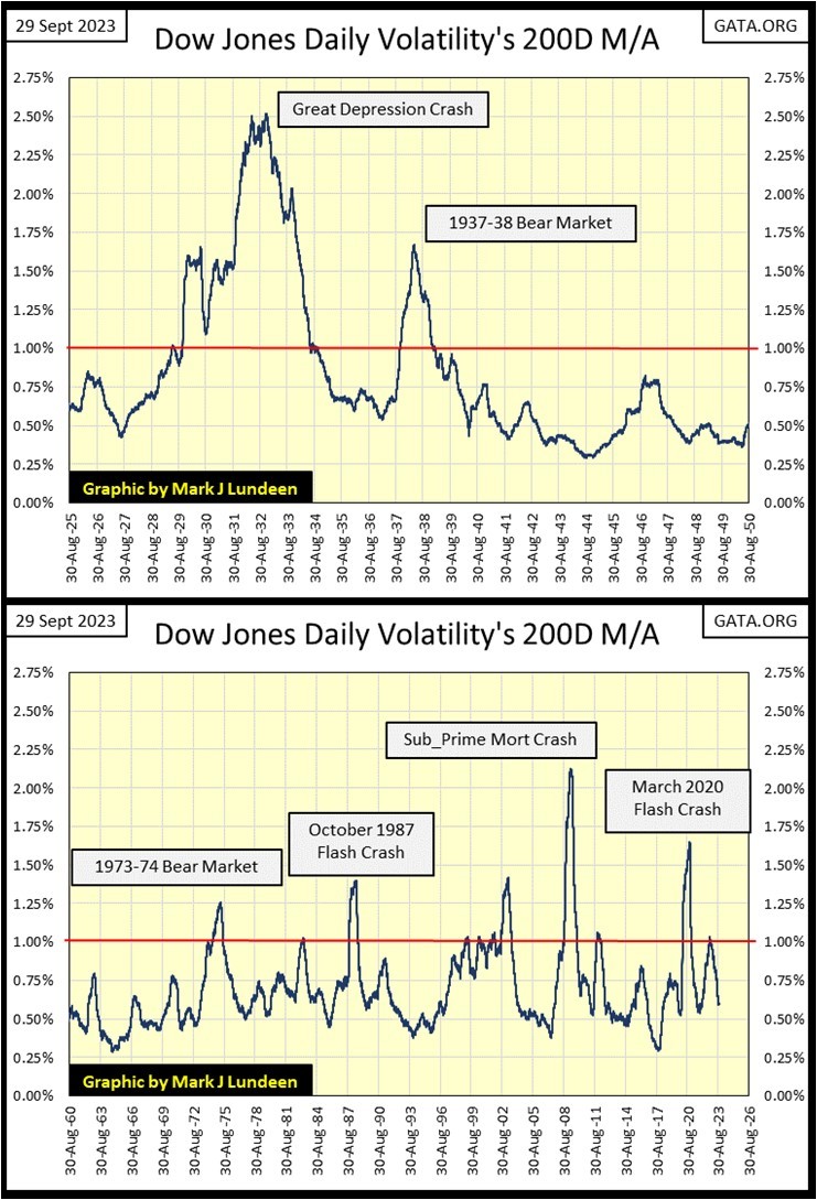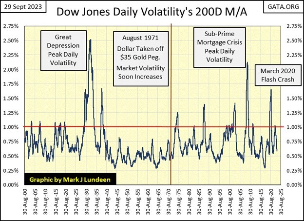 Below we see Dow Jones’ daily volatility’s 200D M/A plotted since 1900, 123 years of data. I’m going to ignore the data prior to 1925, as before 1925 the Federal Reserve’s influence in the market was minimal. Why would that be? The Federal Reserve Act was signed into law by President Wilson in late December 1913, so the Federal Reserve didn’t exist until 1914. WWI (1914 to 1918) kept the “policymakers” busy financing a World War for the allies. Following the war, the economy fell into a deep recession, that bottomed in 1921.