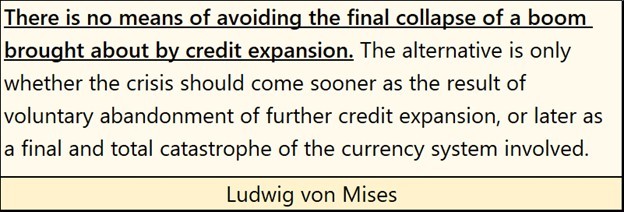 Following August 1971, volatility spikes in the Dow Jones’ daily volatility once again became regular features in the plots above and below, each noting the various booms and busts the idiots at the FOMC induced in the financial markets. These charts also prove that with every boom inflated into the market by the FOMC, Mr Bear also sees his day under the sun with a deflationary bust – no exception, as noted by von Mises below.