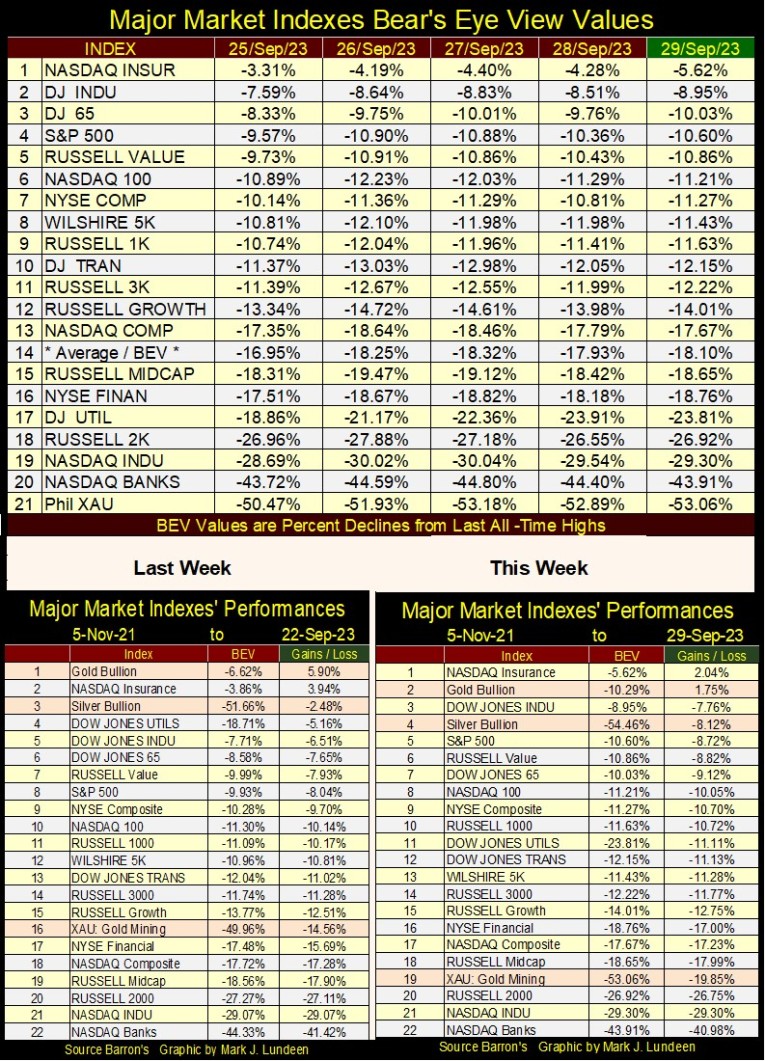 This week the Dow Jones closed with its BEV value closer to the -10% line than its -5% line in its BEV chart below. What to think about that? Well, it hasn’t seen a double-digit BEV value since June 1st, and then the Dow Jones hasn’t seen a BEV Zero (new all-time high) since January 4th of 2022. Should the Dow Jones fall below its BEV -10% line in the weeks to come, I’m thinking it will then test the lows of last autumn, below its BEV -20% line.