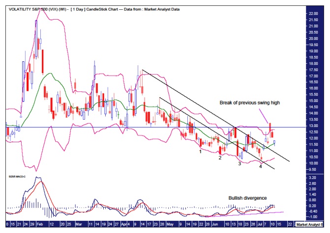 The MACD has been revealing in both the daily and weekly analysis and we can also include the monthly. A bullish divergence has formed with each of the last three consecutive lows in the VIX. Also the Stochastic Indicator is currently quite low and looking ready to turn back up. So perhaps we could surmise that the month of July looks set to witness a nice reversal back to the upside.