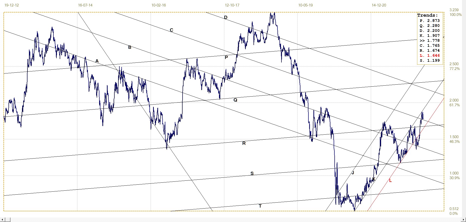 Last week saw the price collapse as steeply as the previous rally under the combined onslaught of a suddenly stronger dollar and the usual month end increased selling, to end a little below line L for the first time. As mentioned above, a brief and small break below a strong formation – typically only to touch and confirm the presence of another preferred gradient not recognised in the analysis – is of little consequence, provided the main trend soon recovers. Perhaps February will prove to be kind to the metals and the rising trend can resume.