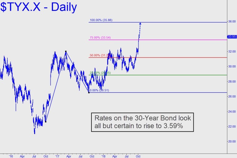 The Ten-Year Note hit 3.25% on Monday, up from 2.83% just five weeks earlier, while the 30-Year reached 3.42%, up from 2.98% during the same period. Rick’s Picks was well ahead of this economically threatening development with a bearish call and a 3.11% target for the 10-Year that went out to subscribers in 2017 when rates were hovering around 2.54%. The 3.11% target was precisely achieved in mid-May, and at the time, we expected it to mark an important top. But the subsequent pullback was so obviously corrective that we raised our targets to levels that lie not far above today’s peaks. With this edition of The Morning Line, however, we are raising the targets yet again to, respectively, 3.59% on the long bond and 3.47% on the T-Note.