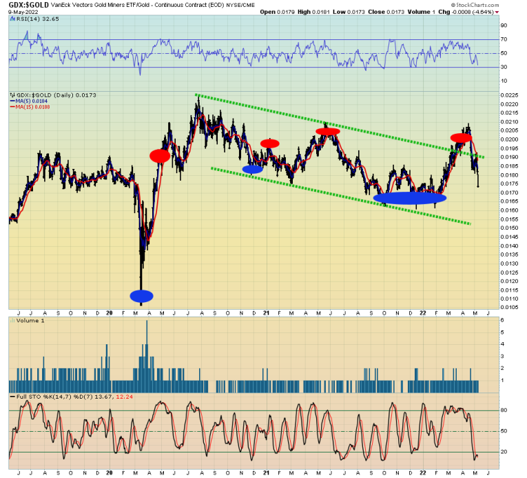 Double-click to enlarge this important GDX versus gold chart. I’m not a big fan of using absolute ratio numbers or chart patterns to invest in the miners. That’s because of the obvious profits that can be had by buying and selling the miners at key gold bullion support and resistance zones.