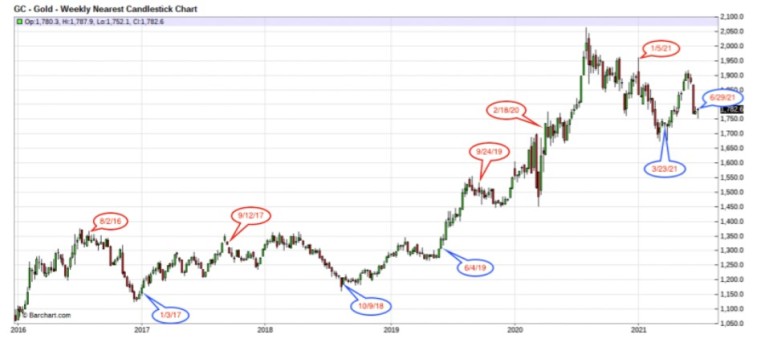 To make this even clearer, let's plot all the CoT highs and lows listed above onto a weekly price chart that goes back to 2016: