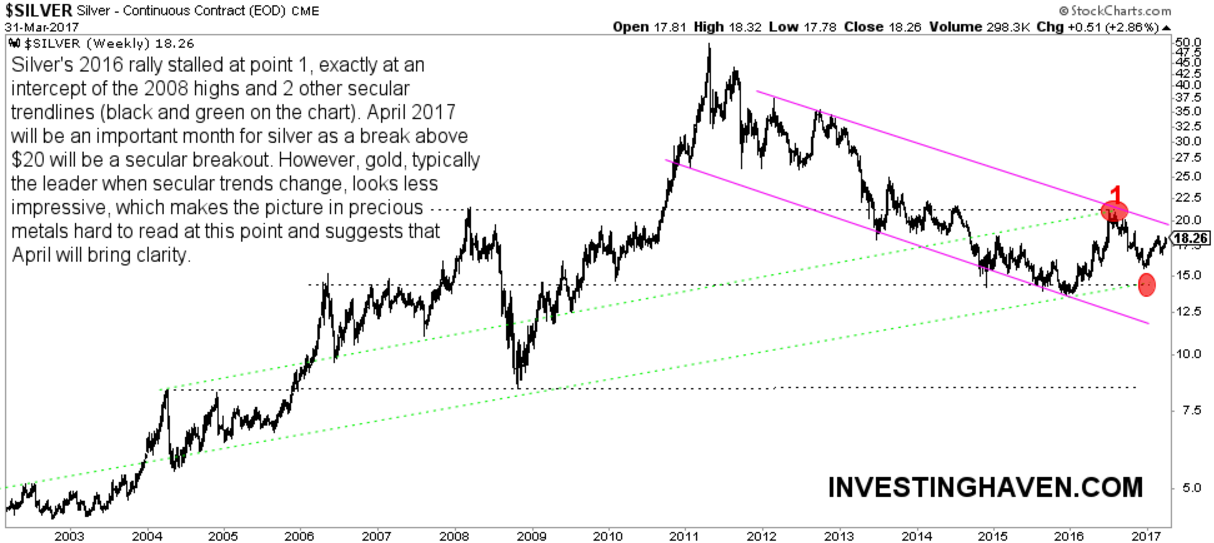 Silver’s 2016 rally stalled at point 1 (below chart), exactly at an intercept of the 2008 highs and 2 other secular trendlines (black and green on the chart). April 2017 will be an important month for silver as a break above $20 will be a secular breakout.