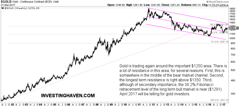 InvestingHaven believes that April 2017 will be an important month for precious metals. Why? Because gold and silver prices are near important price levels. We believe there is a very high probability that a direction will be chosen in the coming weeks. Given the chart setup, the trend in the coming weeks could be telling for the medium term, even long term.