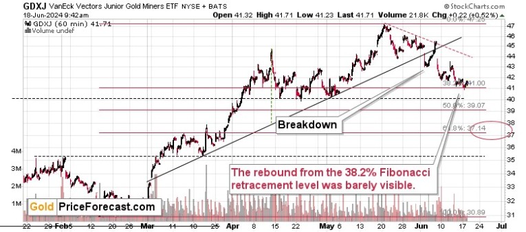 We saw another tiny move higher from the 38.2% Fibonacci retracement, but this one is even smaller than the previous one. It changes nothing – the subsequently smaller rebounds are similar to stone skipping. Eventually, it will plunge. And since the above chart is based on hourly candlesticks, it seems that the move below the 38.2% retracement is just around the corner.