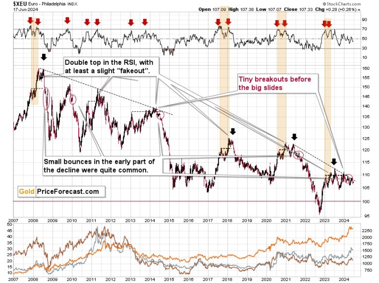 After similar situations (I marked them with red ellipses) the euro declined profoundly, and it was often accompanied by huge declines in the precious metals market, especially in 2008 and 2014.