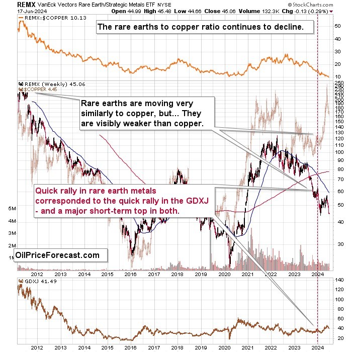 Remember, REMX and junior miners bottomed together in early 2016 and in 2020 – the above is also a subtle sign that miners have further to fall. Most likely much further, which creates a great opportunity for those who are prepared for it.