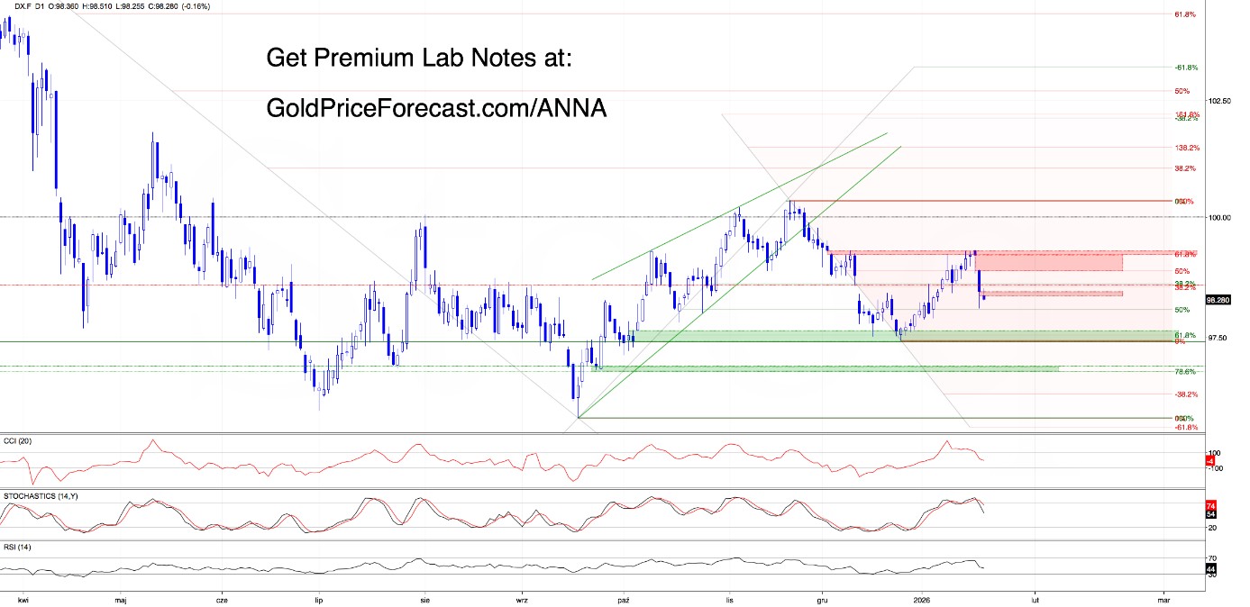 “(…) Friday’s failed move above the upper border of the mentioned rising channel translated into unsuccessful breakout above the 61.8% Fibonacci retracement. Additionally, bulls didn’t manage to close the early-December gap, which together with the current position of the indictors (Stochastic has already printed a sell signal, while CCI is deep in overbought territory and close to rolling over) raises the probability that the dollar’s next meaningful move will be to the south toward the downside targets we’ve already discussed on Friday (…)”