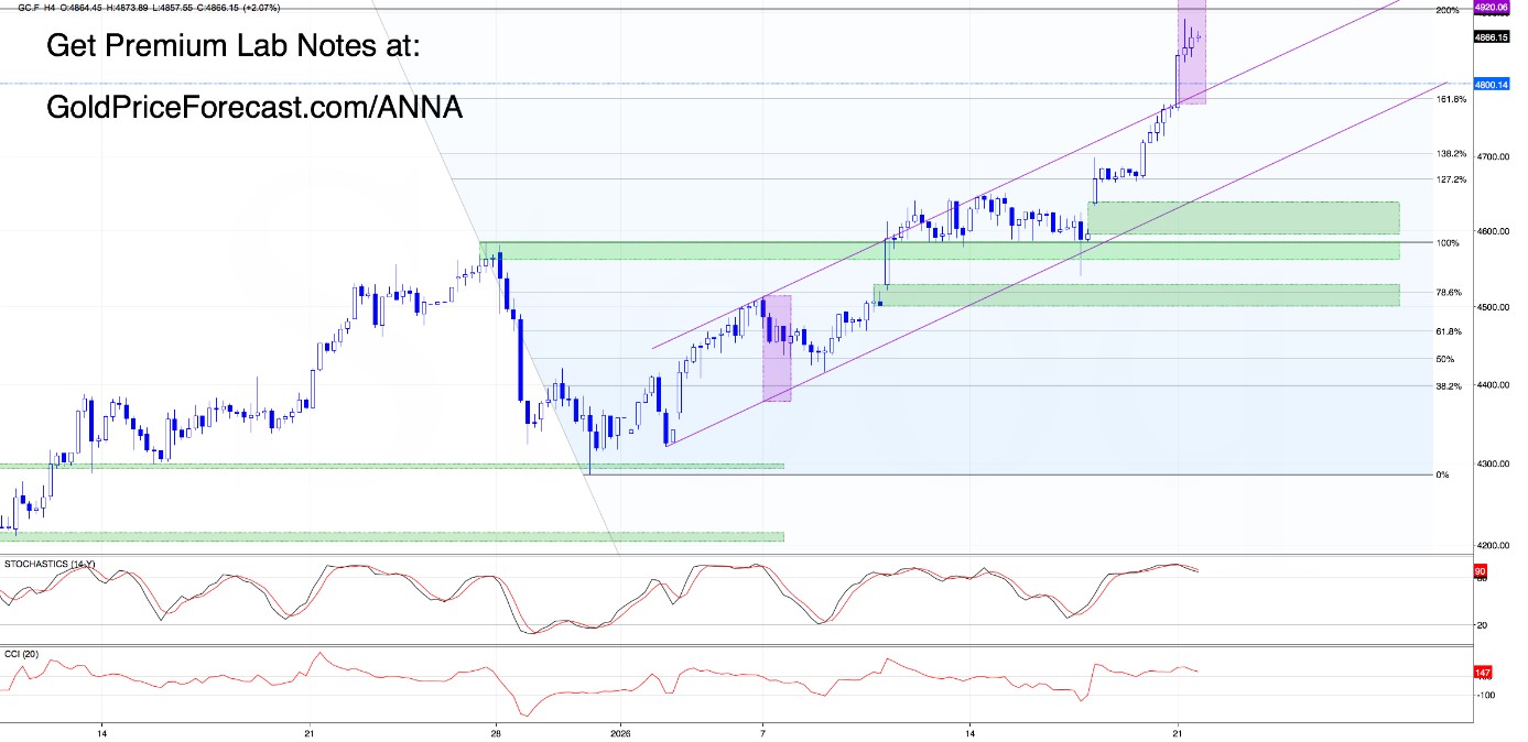 The next logical target sits around 4768-4780, where price may run into resistance cluster created by the upper border of the purple rising channel and the 161.8% Fibonacci extension (marked by the red ellipse on the H4 chart).