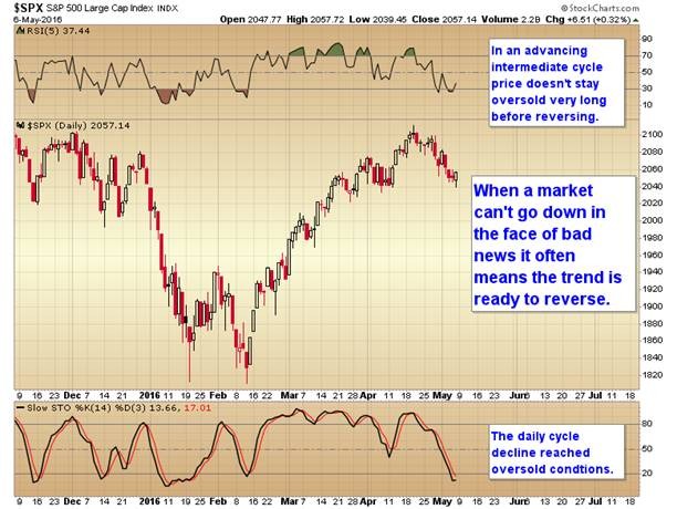 In an advancing intermediate cycle price doesn’t stay oversold very long before reversing. The daily cycle has reached oversold conditions.