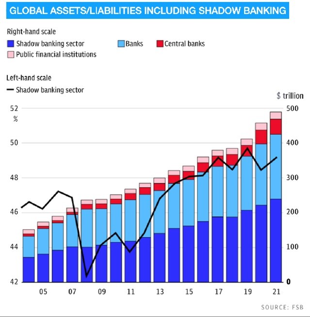 But lurking in the murkiness is also the global financial assets/liabilities which is almost $500 trillion including the shadow banking system at 46% of the total. The shadow banking sector includes pension funds, hedge funds and other financial institutions which are largely unregulated.