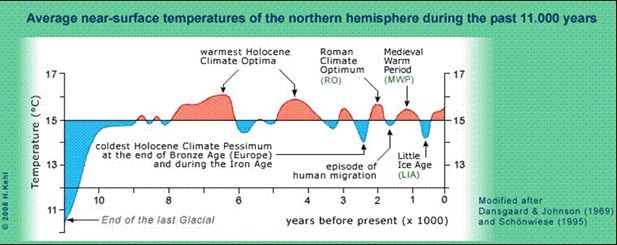 The climate cycle graph below covering 11,000 years shows that there has been numerous periods with warmer temperatures than currently. At the peak of the Roman Empire 2000 years ago, Rome had a tropical climate.