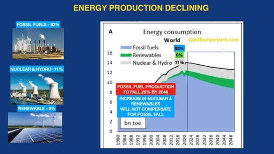 Partly due to the increased cost of producing energy, fossil fuel production will fall by 26% by 2048. Increases in nuclear and renewables will not compensate for this decline.