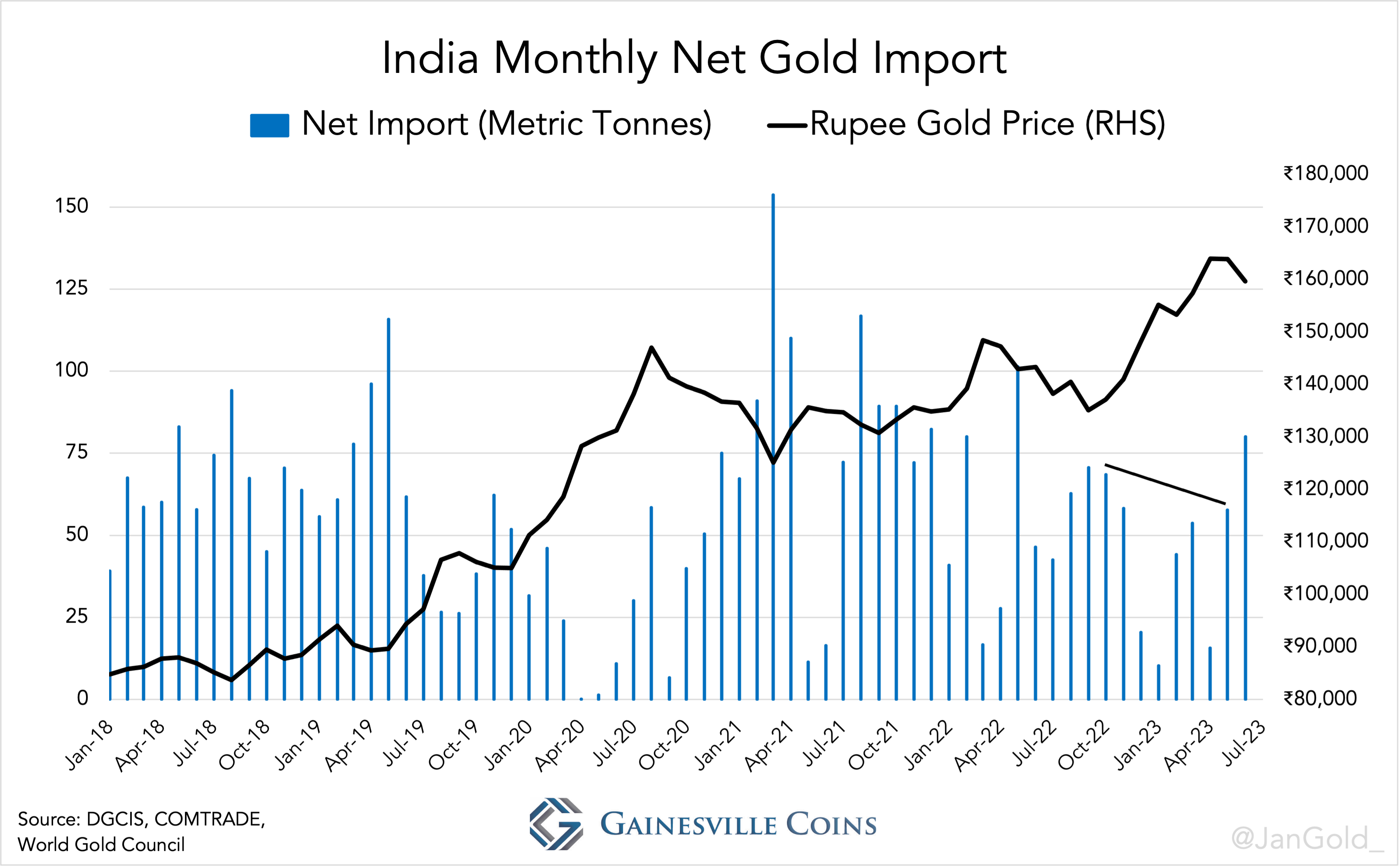 It wasn’t India, as the Indians, like most people in the East, are price sensitive. From October through June India’s net gold imports declined, with the exception of June when the price reverted.