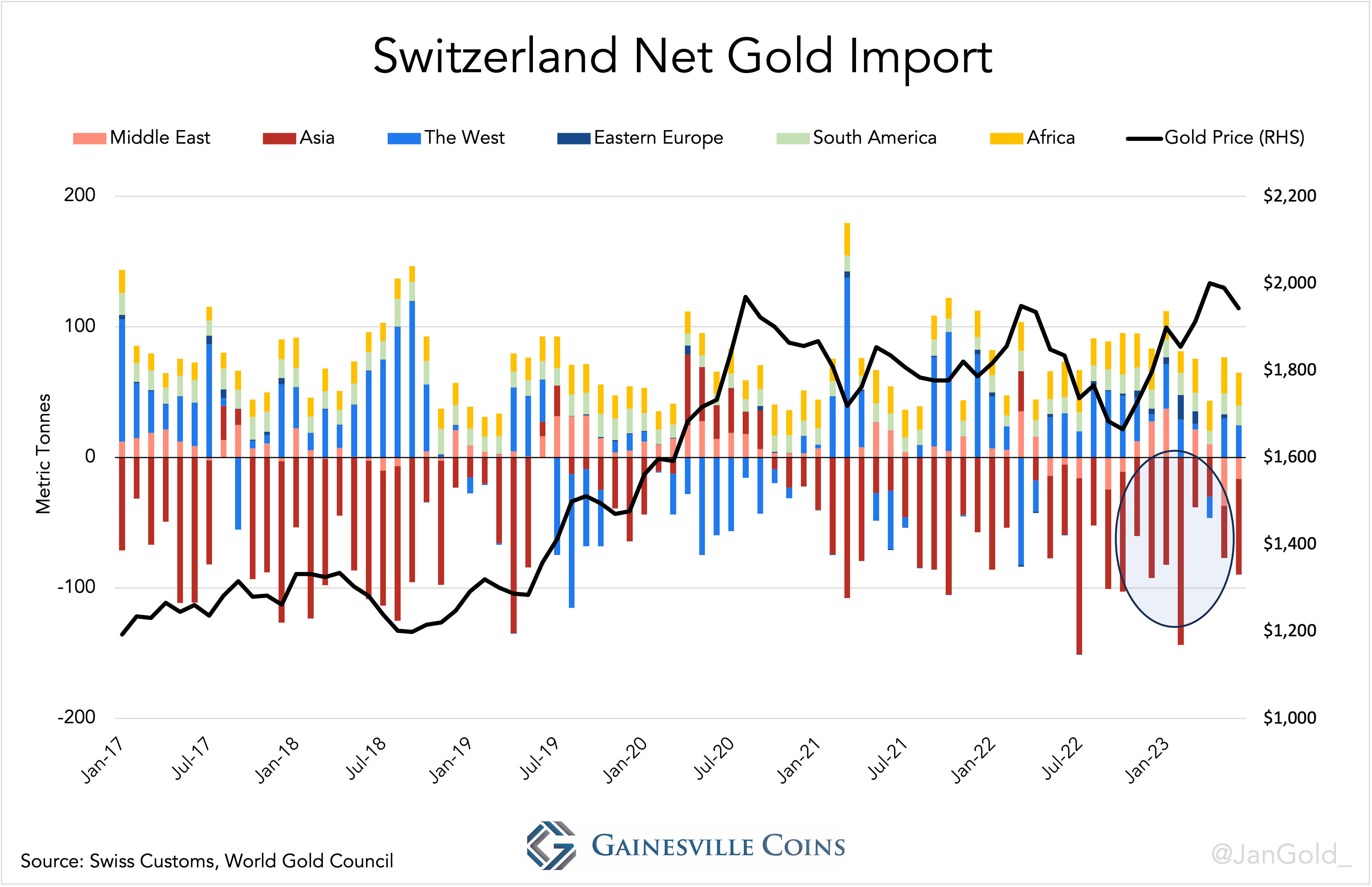The Swiss customs department lets users track the flow of goods per continent. Apparently, Switzerland was a huge net exporter to Asia when the gold price went up.