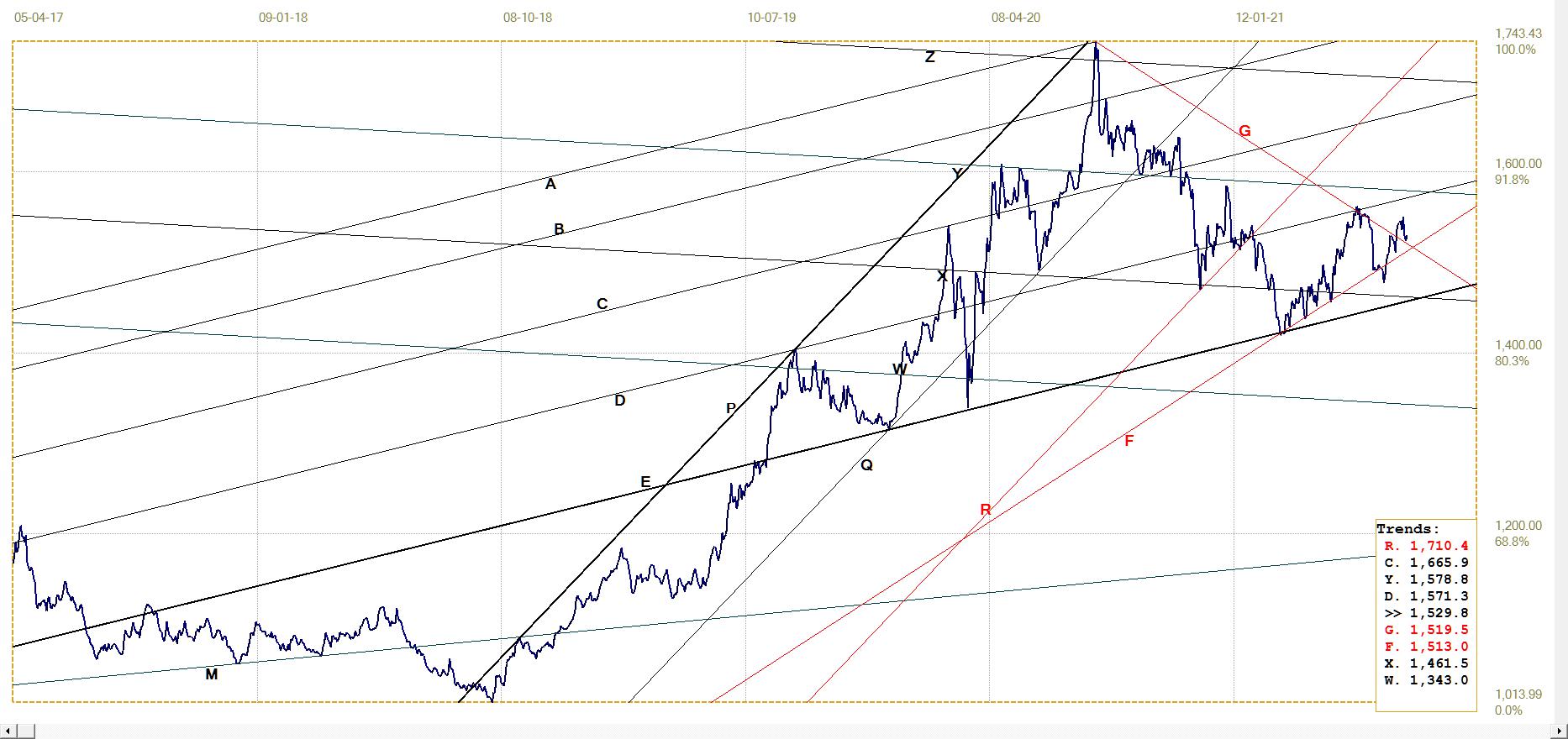 The price of gold has again broken above the steep inverted megaphone UV, which in principle should have resulted in a steep, sustained move. The previous break above line V ended at line W to form a new megaphone pattern. (As always, lines V and M are derived from the master gradient, M). These patterns anticipate strong moves when broken to the upside, but they do not predict when this will happen.