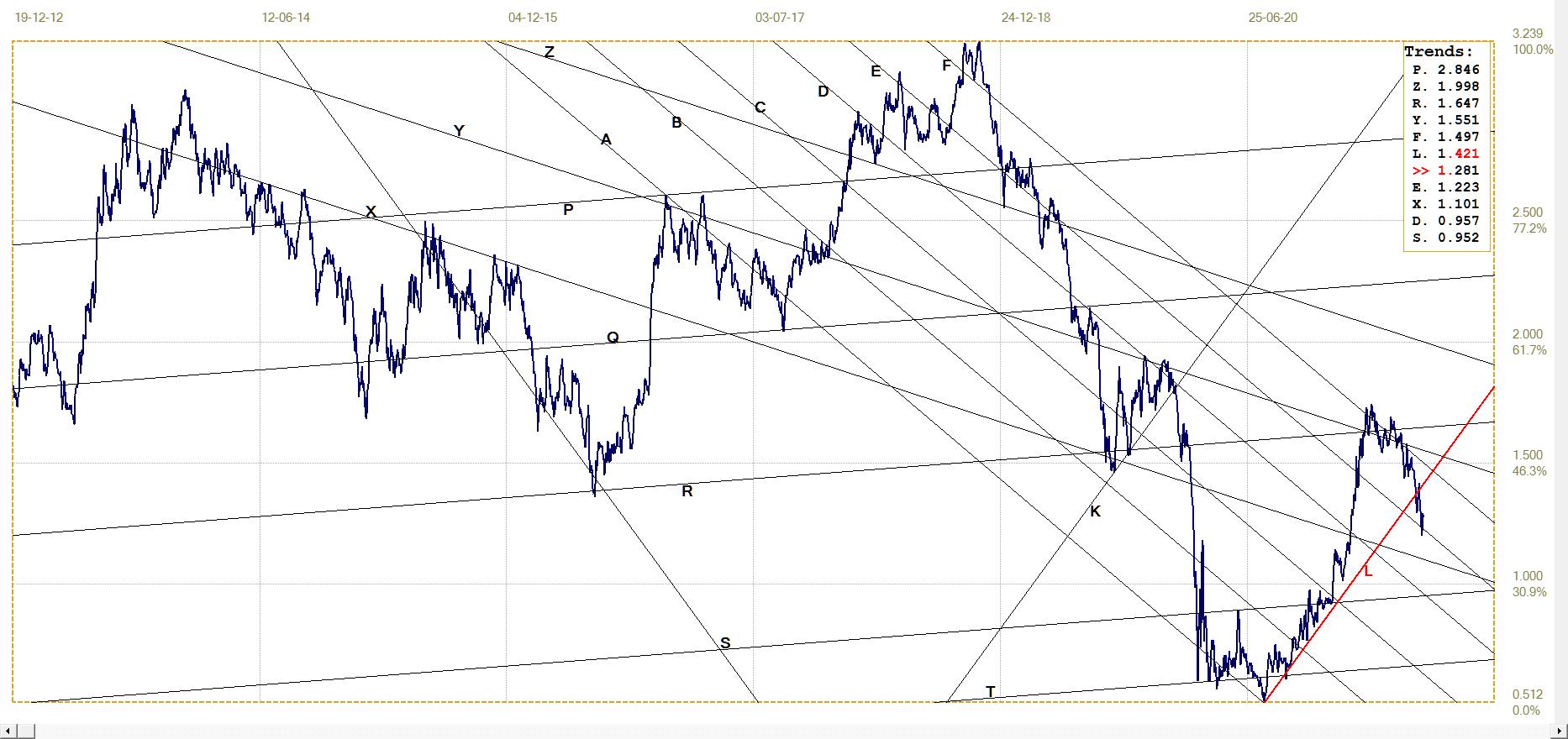 The steep fall in the price of silver, to break clear below $26 and to test the $25 level has the price down to the bottom of the redefined channel KL. Line L is located in the centre of the bifurcated bottom patter, often used as an important anchor point.