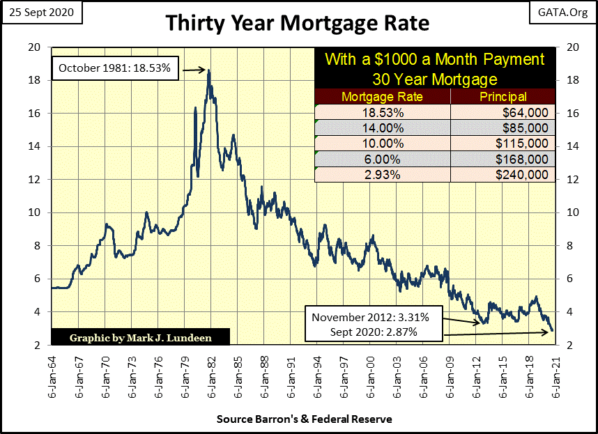 The boom in single family homes is a monetary phenomenon. As seen in the chart below mortgage rates have been dropping since October 1981 when they peaked at 18.53%. In October 1981, with a rate of 18.53%, a $1000 monthly payment could afford a mortgage of only $64,000. A few weeks ago mortgage rates declined to 2.96%, where a $1000 monthly payment could afford a mortgage of $240,000.