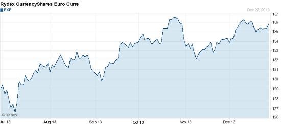 In 2013 the US and especially Japan cheapened their currencies versus the euro, which was supported by the European Central Bank’s relative reluctance to monetize the eurozone’s debt. The following chart shows the euro over the past six months: